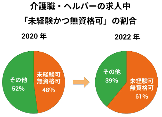 PR TIMESによれば、2022年の介護職・ヘルパーの求人のうち「未経験かつ無資格可」のものは61%に昇るとのこと。