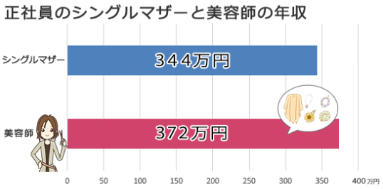 美容師は、資格を取りやすく、将来、自分のお店を持つこともできる仕事です。年収は平均372万円。シングルマザーの平均より28万円高いです。
